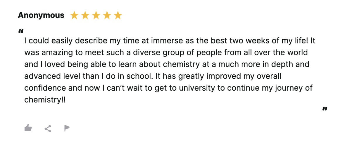 College application benefits: Immerse offers several concrete ways to strengthen your university applications, such as a tutor recommendation letter, academic credit, and the Certificate of Completion. Many students also find the experience helpful for narrowing down a college major.